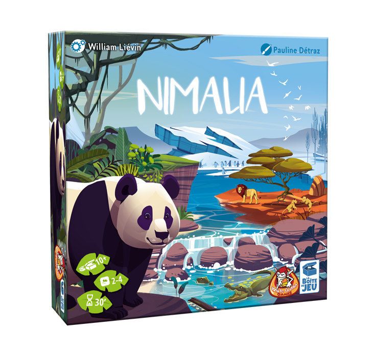 In Nimalia ontwerp je in 5 rondes de beste dierentuin. Van krokodillen tot beren en leeuwen: ze verdienen allemaal een plaats in de dierenverblijven. Rangschik kaarten strategisch om aan de eisen van elk dier te voldoen en scoor zoveel mogelijk punten door je aan de verschillende doelen te houden. Nimalia heeft een unieke combinatie van spelmechanismes (draften, overlappende kaarten en wisselende doelen per ronde), het spel bevat mooie grote tegels, maar zit in een klein doosje en het is toegankelijk, herspeelbaar en tactisch.