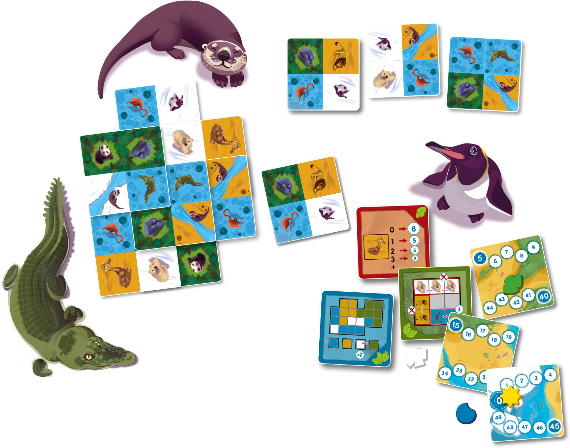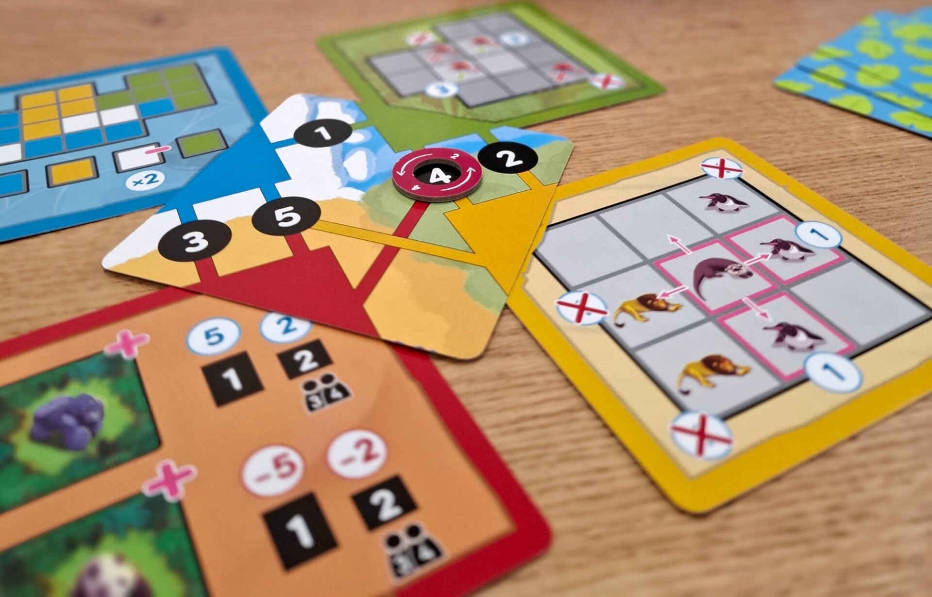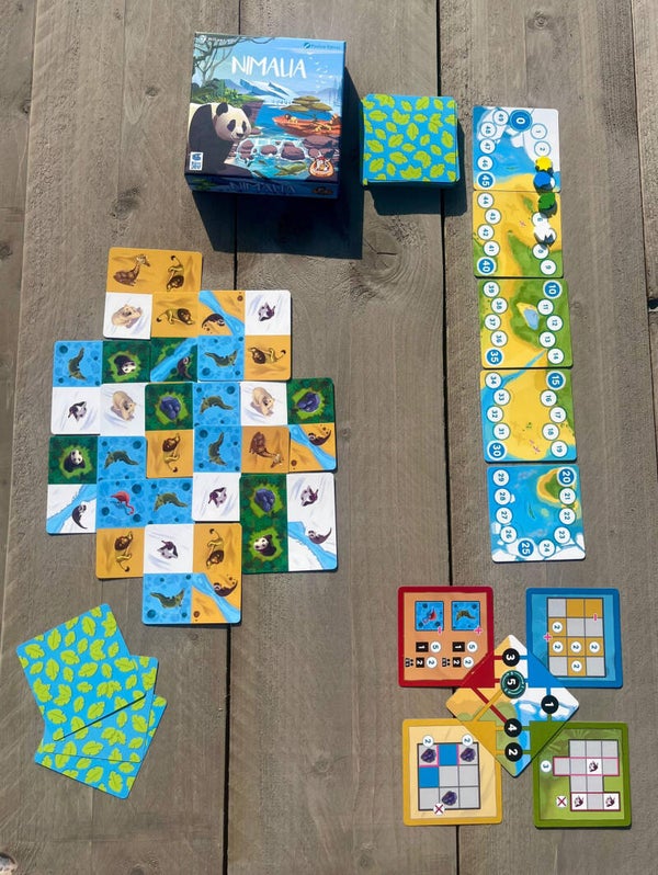 In Nimalia vind je in totaal 22 verschillende opdrachten van verschillende moeilijkheidsniveaus, waardoor je het gemakkelijk kunt aanpassen aan je gezelschap, want je gebruikt er per spel slechts 4. In elk van de 5 rondes dien je aan 2 of 3 van de opdrachten te voldoen, want na elke ronde zijn er andere actief. Aan het begin van een ronde heb je een aantal kaarten op hand. Je beurt bestaat uit het plaatsen van een dierkaart en elke geplaatste dierkaart moet een andere kaart deels overlappen, daarna geef je je overgebleven kaarten door. Hierna doe je hetzelfde met de twee kaarten en de laatste kaart die je krijgt plaats je in je grid. Nimalia is dus een echt puzzelspel voor de hele familie dat spelers van allerlei niveaus bij elkaar brengt!